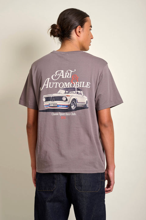 Sa teinte cement, un gris clair minéral, renforce l’aspect brut et authentique de la pièce. Au dos, le visuel d’une voiture vintage vient ancrer le tee-shirt dans une esthétique rétro maîtrisée, entre élégance automobile et culture graphique.